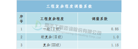 工程復(fù)雜程度調(diào)整系數(shù):0.8~1.2(工程復(fù)雜程度具體調(diào)整系數(shù)由工程咨詢機(jī)構(gòu)與委托單位根據(jù)各類工程情況協(xié)商確定)。