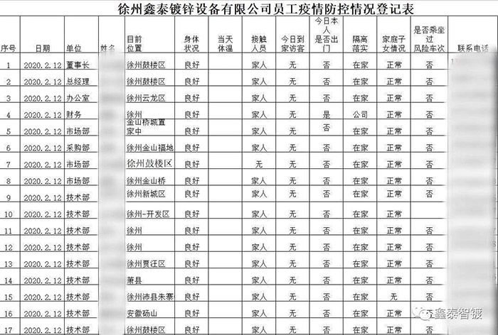 全面掌控公司及家屬疫情期間基本情況。于2月9日開始建立《鑫泰公司人員疫情基本情況登記表》,每天登記員工信息,特別是返廠前來源地、返徐或來徐時間、是否有湖北旅居史、返廠前前兩天體溫是否正常、是否有感冒、發燒、氣促狀況、返徐居住地等。重點關注6名外地復工人員,安排專人對其情況進行跟蹤,返徐后根據上級規定,進行居家隔離。